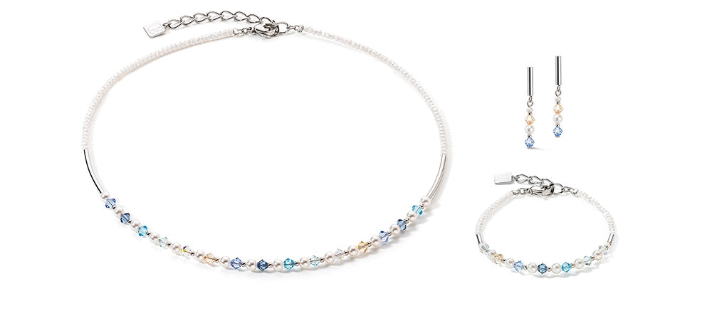 Timelessly beautiful and lovingly handcrafted. This necklace in sparkling blue, champagne and silver interspersed with white European Crystal Pearls is absolutely perfect for any occasion. A finer COEUR DE LION style featuring shades of blue, champagne and white on stainless steel.