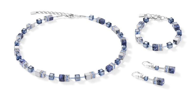 A classic GEO CUBE style featuring Swarovski Crystals, rhinestone rondelles, glass, glossy hematite and beautiful natural navy blue Sodalite set on stainless steel. A bold style with each piece featuring sodalite being truly unique.