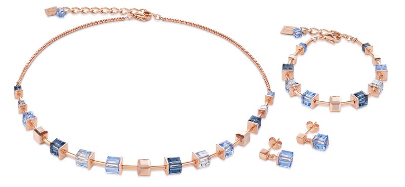 Muti coloured and Rose Gold Swarovski Crystals combined with rose gold plated stainless steel chain. A captivating GeoCube style featuring soft dusky tone on tone blues on a flexible chain.