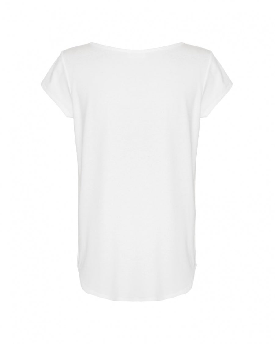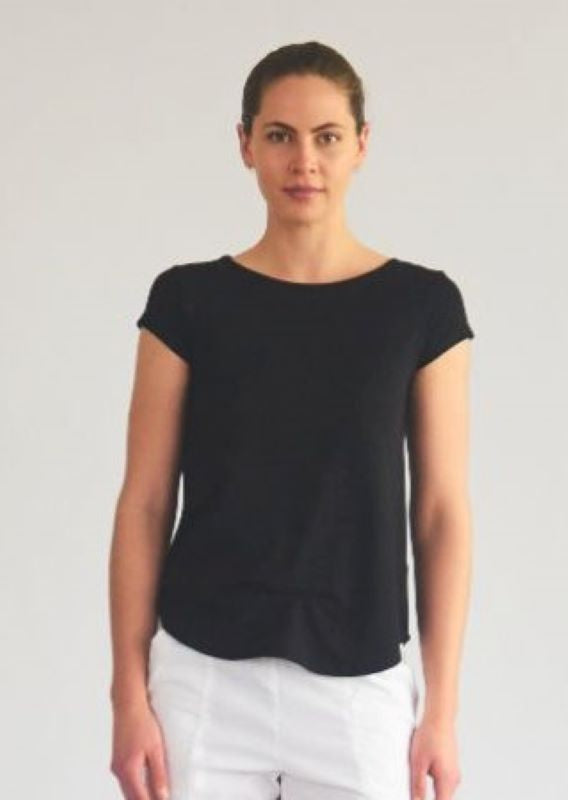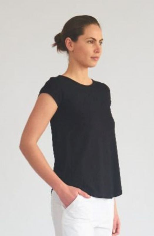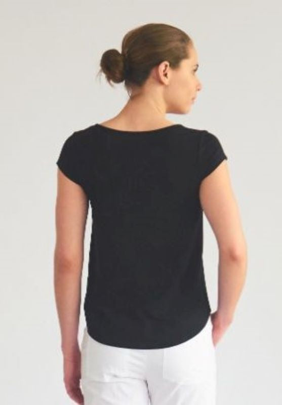 The Café T is the perfect wardrobe staple. Featuring a boat neckline and flattering cap sleeve, it is a great trans-season piece worn with slim pants or skirt.