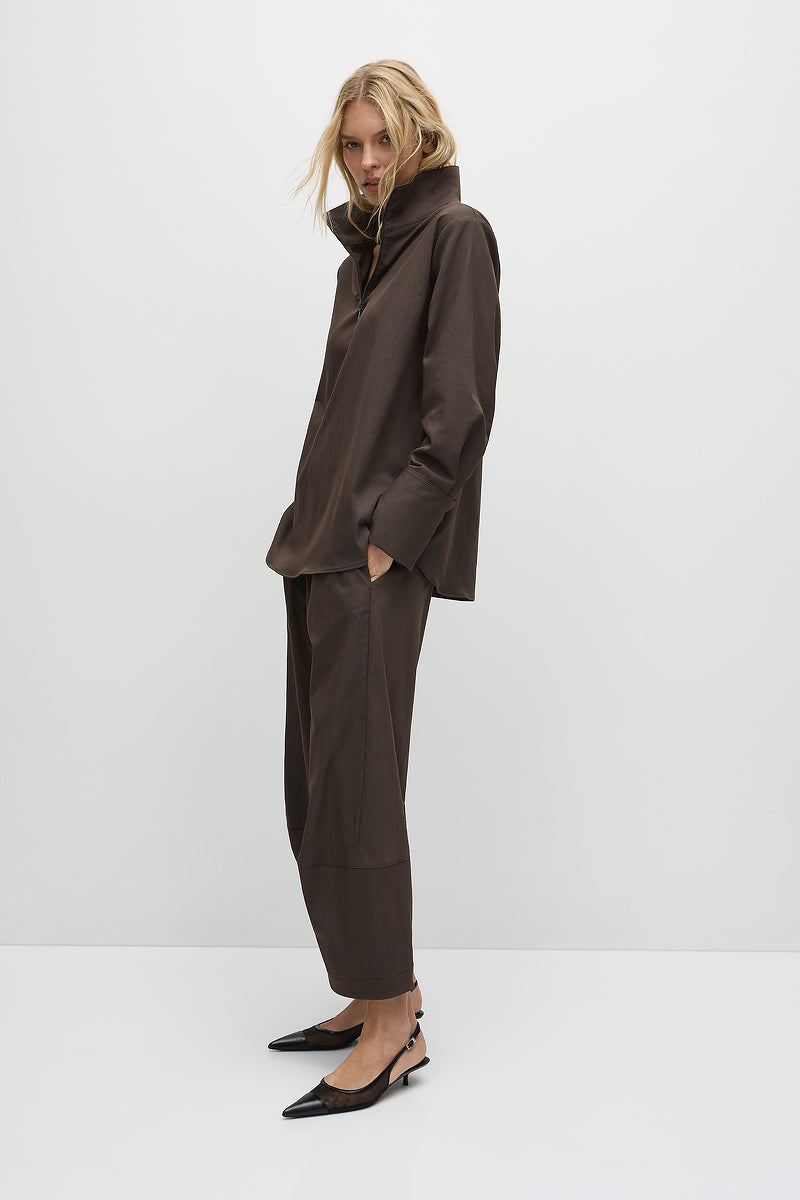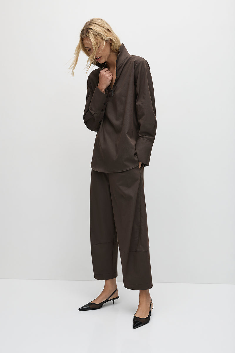 Crafted from Gravitene, a compressed Memory Stretch Micro Twill with cotton touch .The Cone Pant offers an exaggerated barrel silhouette and lower leg panel details.