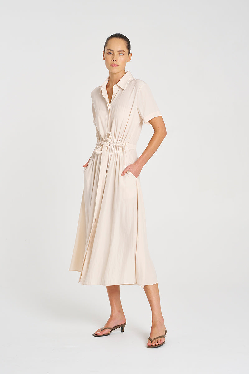 Crafted from Mela Purdie's classic Mache, a fine Denier technical weave with an airflow finish. The Draw Waist T Dress features a relaxed silhouette with a concealed placket button front and waist tie. This is an essential for your capsule wardrobe.