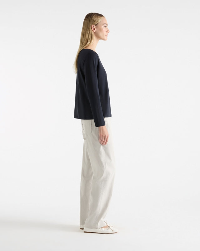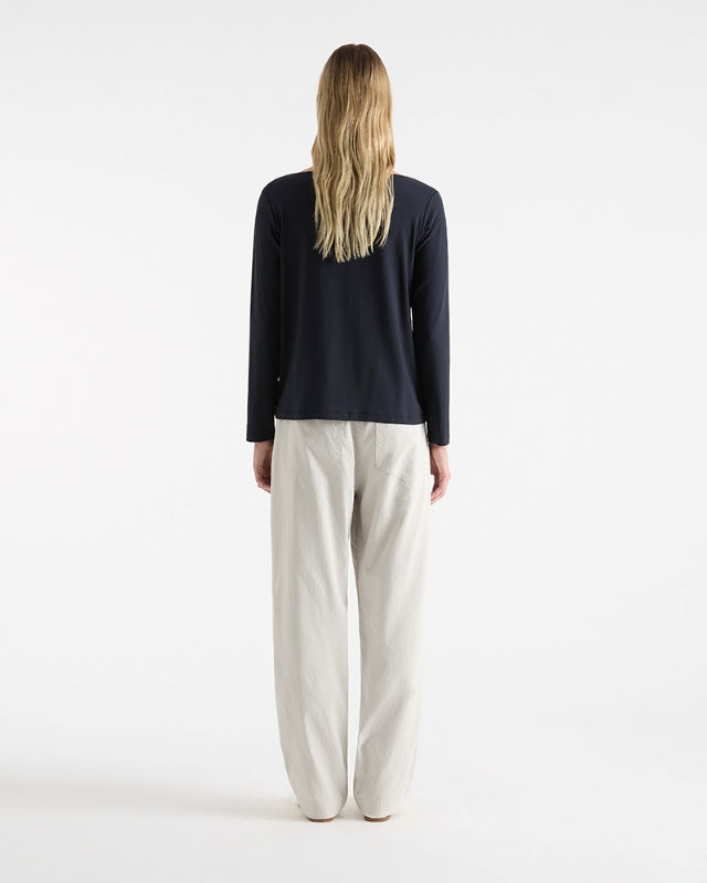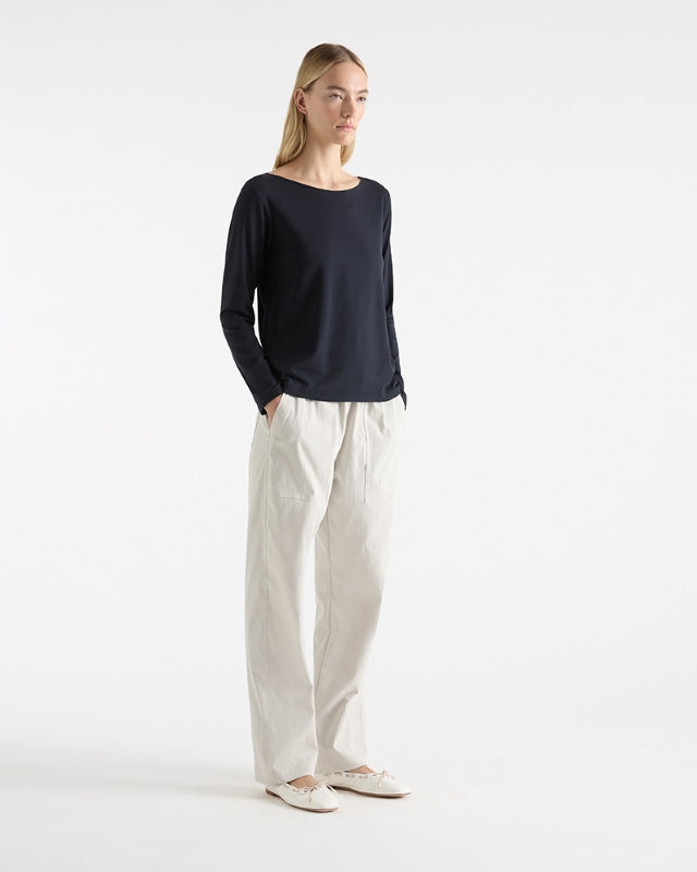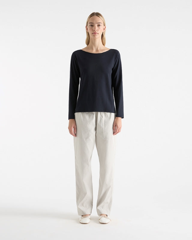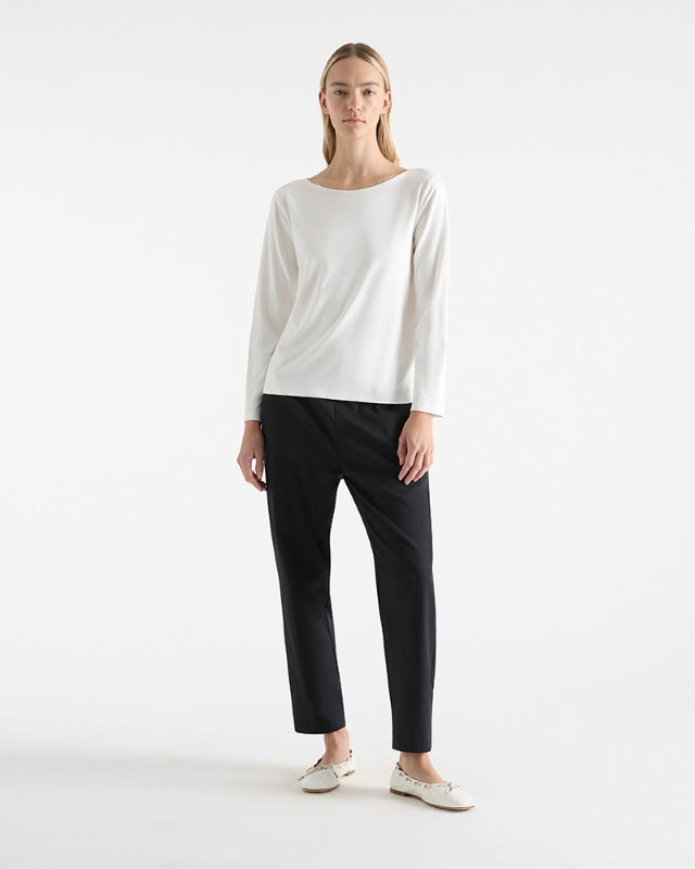 Mela Purdie’s classic Boat Neck now has a relaxed silhouette. Extra room has been added to the waistline to create a comfort top that has an urban edge. This has long sleeves to the wrist. Wear it with the soft zip pant for the perfect travel ensemble.
