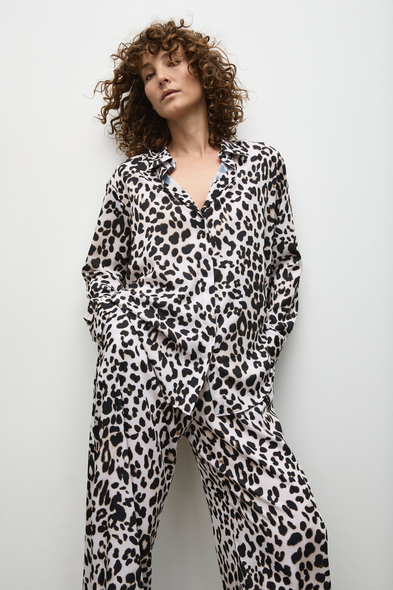 Crafted from Mela's luxurious Cheetah Print Charmeuse. The Maxi Pace Pant highlights a wide leg silhouette in a Maxi length