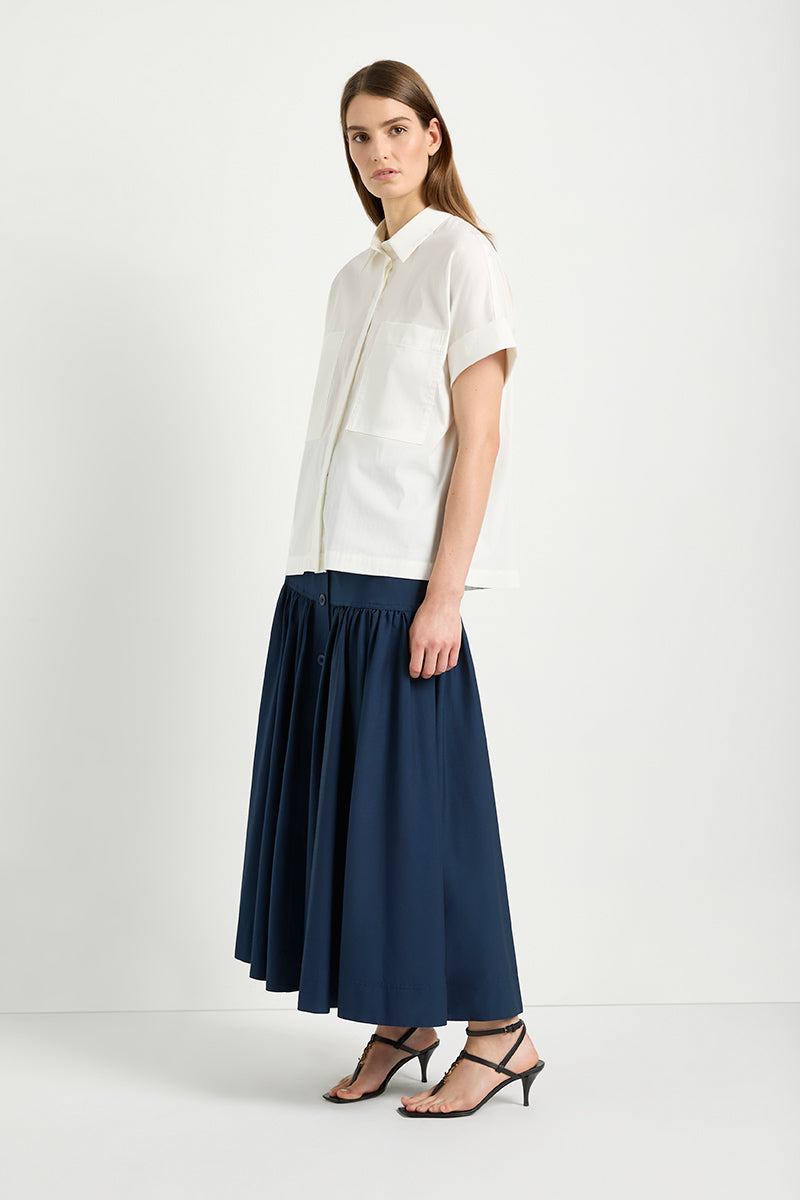 Crafted from Mela Purdie's Microprene. A crisp, cotton rich, high stretch fabrication with a polished finish The Meridian Skirt features gathering and button closure details.