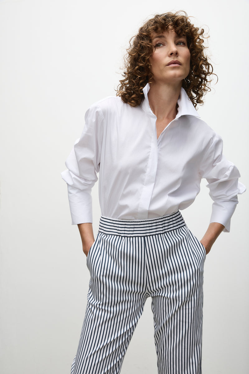 Discover Mela Purdie's Indigo Stripe Popilene fabric, a two- tone vertical stripe, cotton, elastane blend with high stretch and a polished finish. The Nomad Pant features a tapered fit with a wide elasticated waistband.