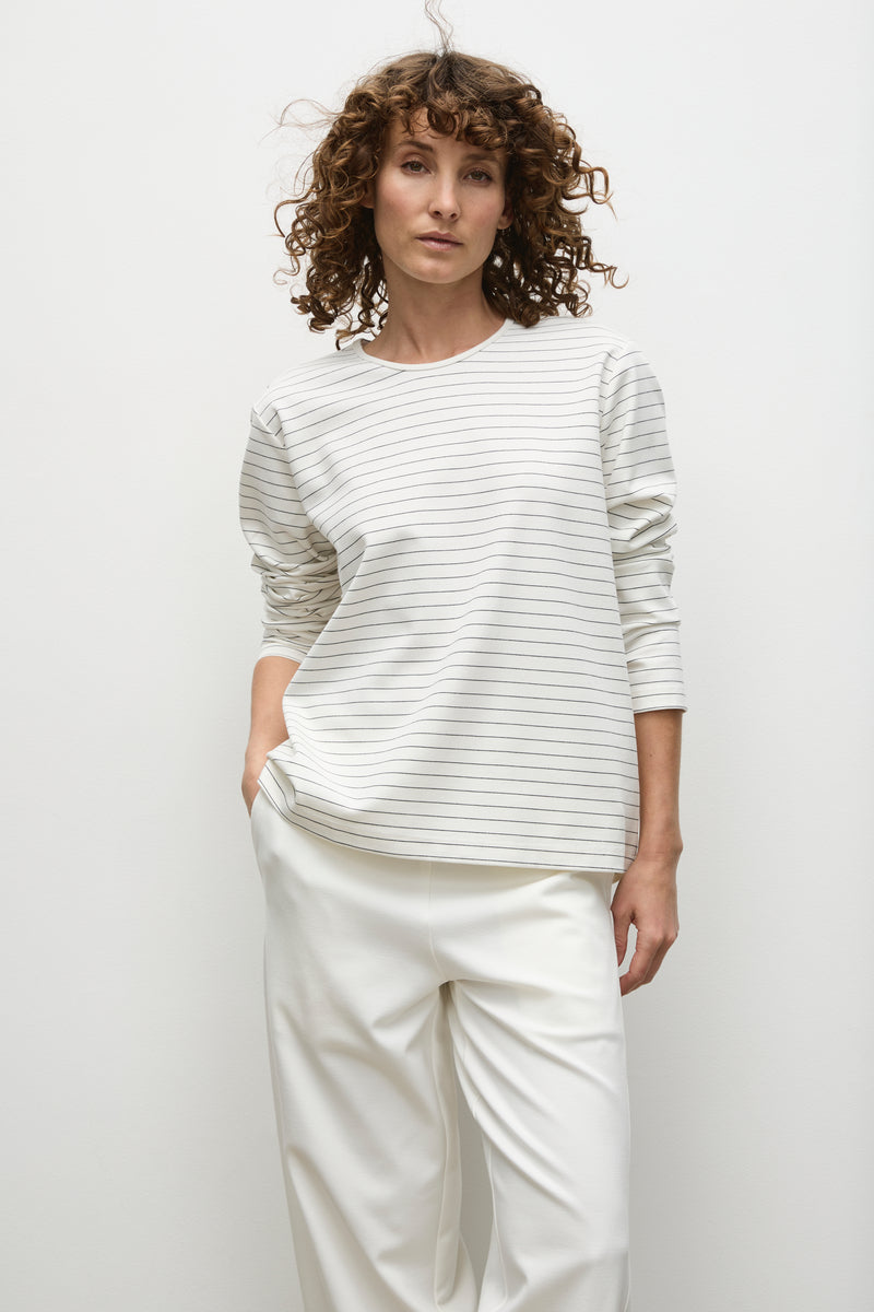 Crafted in Mela Purdie's firm and comfortable Micro-stripe Ponte. The Trunk Sweater features a timeless boat shaped neckline and built in comfort.