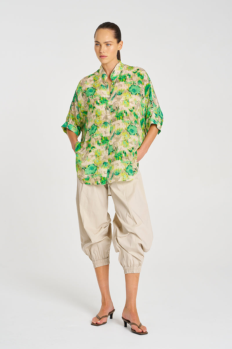 Crafted in Mela Purdie's mid-weight, soft washed Silk Crepe De Chine, featuring the bold Silk Lilly Print. The Villa Overshirt offers a relaxed fit silhouette and stand collar, this is a wardrobe essential.