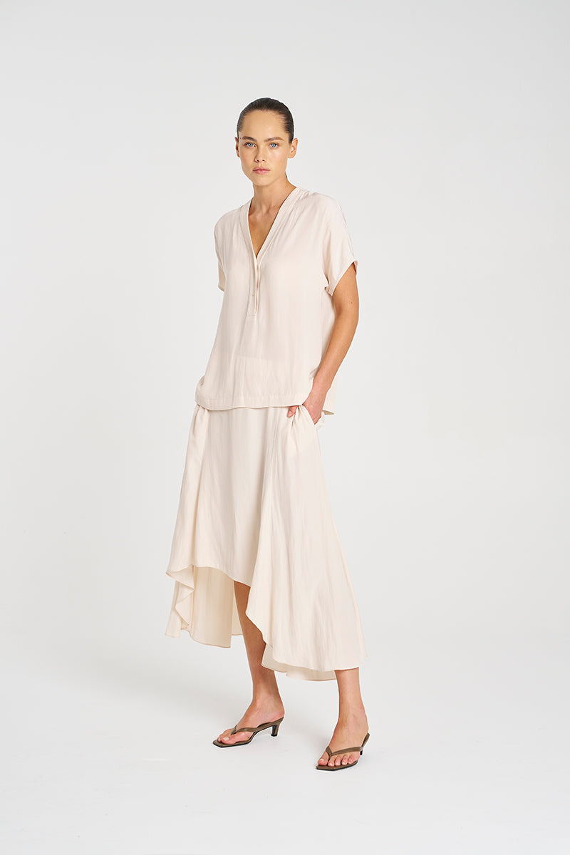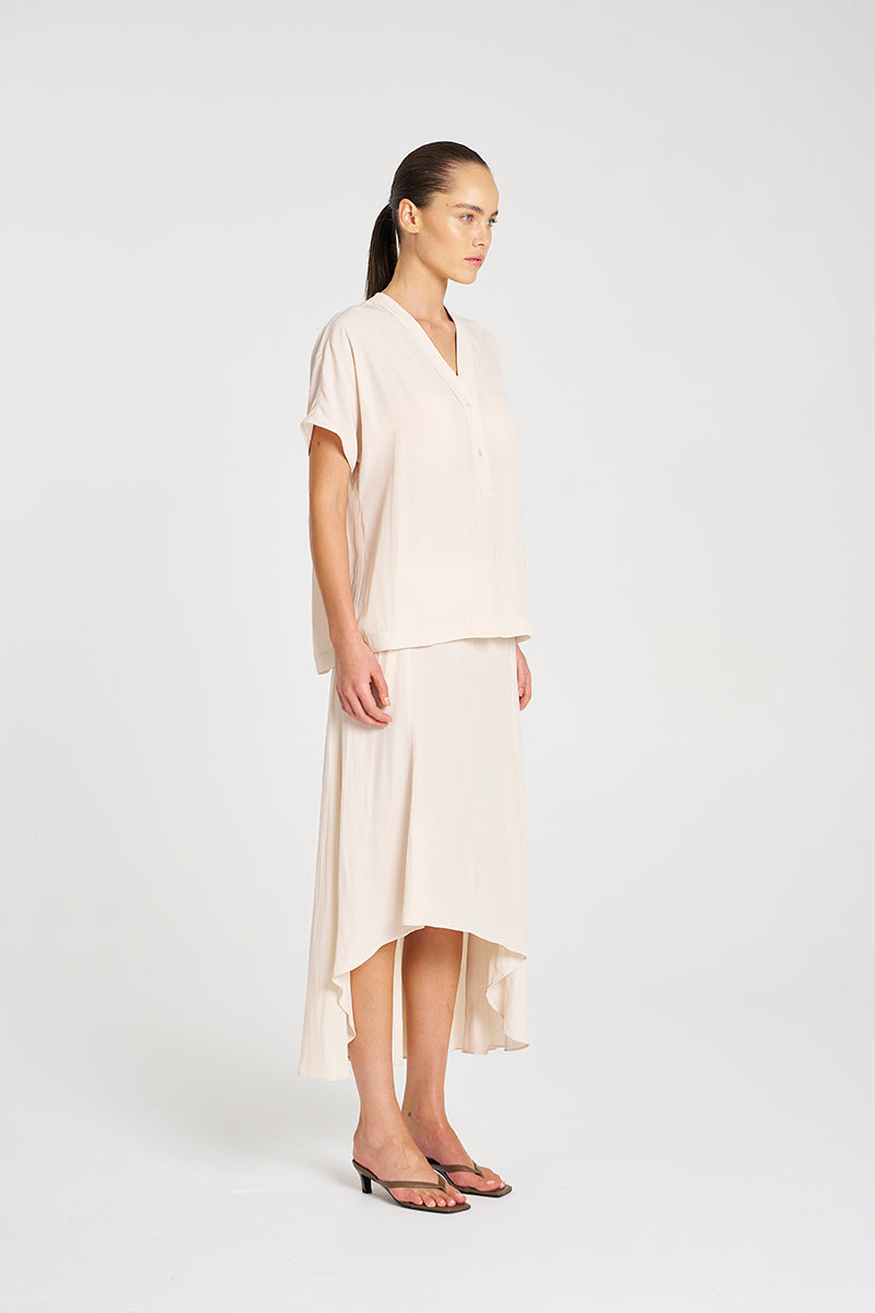 Crafted from Mela Purdie's classic Mache, a fine Denier technical weave with an airflow finish. The Wedge Tab Shell features a cap sleeve and a flattering neckline with a button closure.