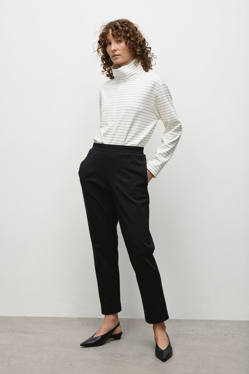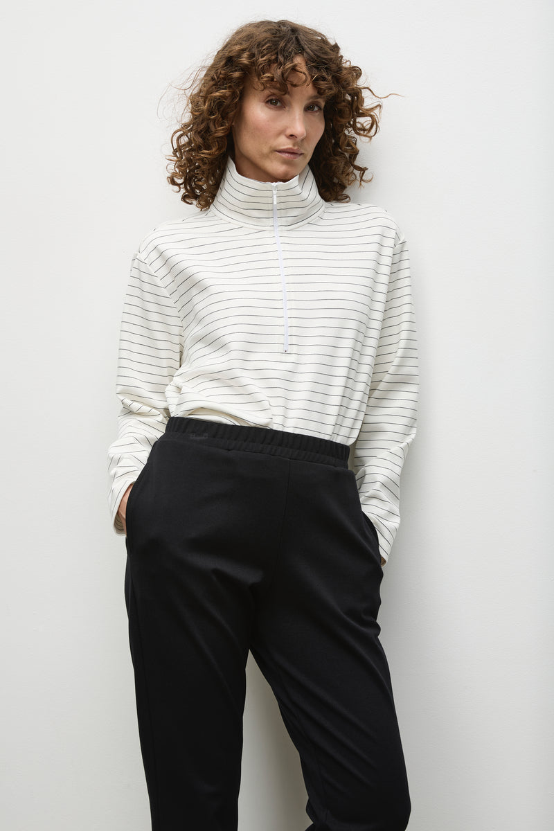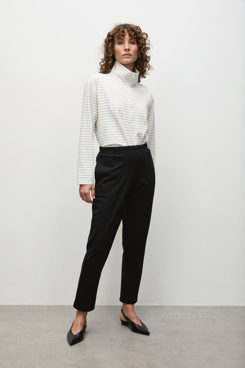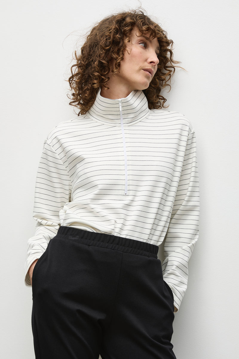 Crafted in Mela Purdie's firm and comfortable Micro-stripe Ponte. The Zip Front Sweater features a half zip through the collar and long sleeves.